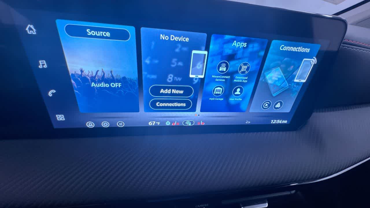 - Radio: AM/FM/SiriusXM Audio System -inc: 12.3" color touchscreen display w/6 speakers, Bluetooth® hands-free phone system, streaming audio via Bluetooth®, NissanConnect Services powered by SiriusXM featuring wireless Apple CarPlay, wireless Android Auto, Siri eyes free and hands-free text messaging assistant, audio and Bluetooth® steering wheel switches and Wi-Fi hotspot