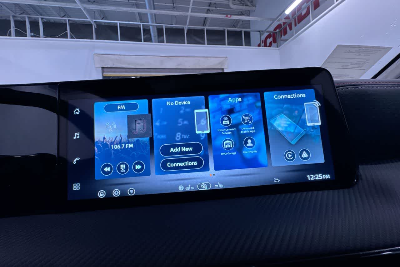 - Radio: AM/FM/SiriusXM Audio System -inc: 12.3" color touchscreen display w/6 speakers, Bluetooth® hands-free phone system, streaming audio via Bluetooth®, NissanConnect Services powered by SiriusXM featuring wireless Apple CarPlay, wireless Android Auto, Siri eyes free and hands-free text messaging assistant, audio and Bluetooth® steering wheel switches and Wi-Fi hotspot