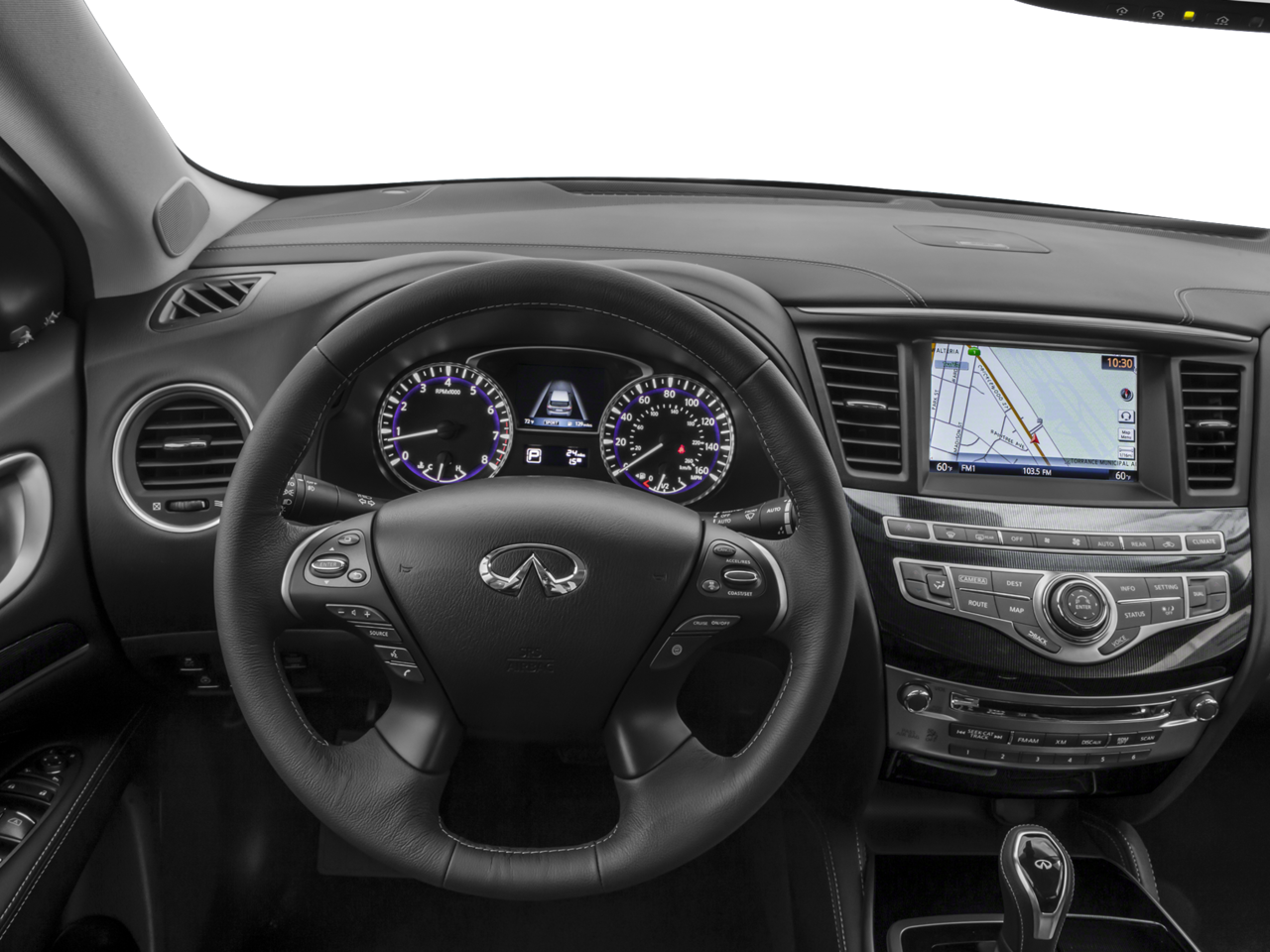 - Radio: AM/FM/CD/MP3 Audio System -inc: 6-speakers, Radio Data System (RDS), speed-sensitive volume control, 8-inch color vehicle information display, INFINITI InTouchTM system w/HD radio, SiriusXM Satellite radio w/90 day complimentary trial, SiriusXM travel link w/4 year complimentary trial access to weather, fuel prices, stocks, sports and movie times, voice recognition for audio, Bluetooth®, vehicle information including music search by voice, streaming audio via Bluetooth® wireless technology, USB connection port for iPod interface and other compatible devices, illuminated steering wheel-mounted audio controls, auxiliary audio/video input jacks in front center console, SMS/email display function, 3 USB charging ports, and INFINITI controller